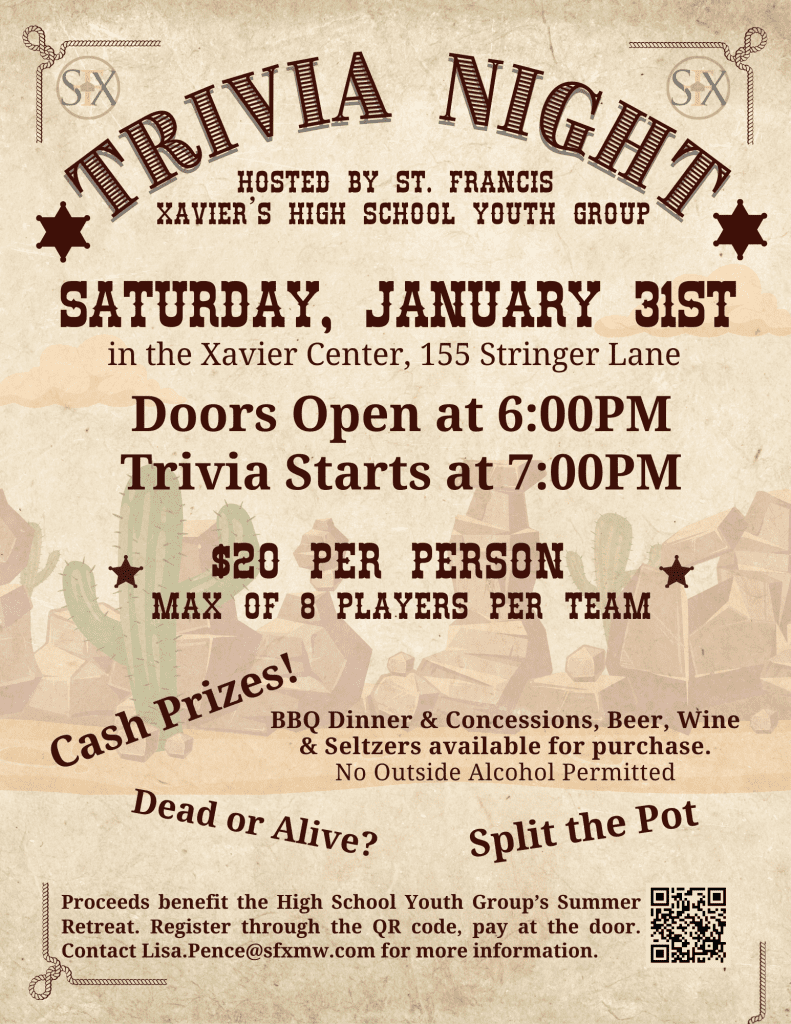 Join us for Trivia Night at SFX in the Xavier Center on January 31st, 2026 at 6PM. $20 per person, limit of 8 players per table/team. All proceeds benefit the High-School Youth Group. Reserve your spot HERE, Pay at the door. Contact Lisa Pence (lisa.pence@sfxmw.com) for more information.