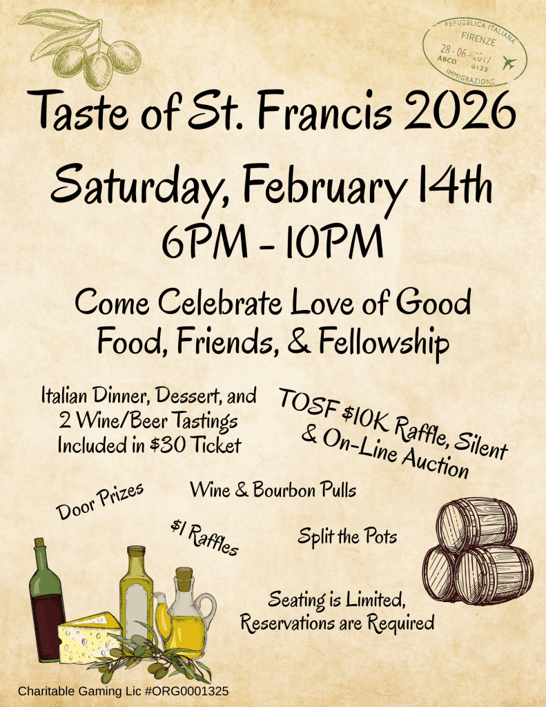 The Taste of St. Francis is back in 2026 and taking over Valentine’s Day. Whether you are spending it with that “special someone” or a group of friends and family, the Taste is the perfect place to celebrate. The event will host the $10,000 Raffle Drawing, On-line & Silent Auctions, Split the Pots, and Wine & Bourbon Pulls. In place of the small bites from different vendors, there will be an Italian Buffet along with wine and beer tastings. Event Tickets will go on-sale in mid January and seating will be limited, so watch the bulletin for details or contact wende.aubrey@sfxmw.com for more information.