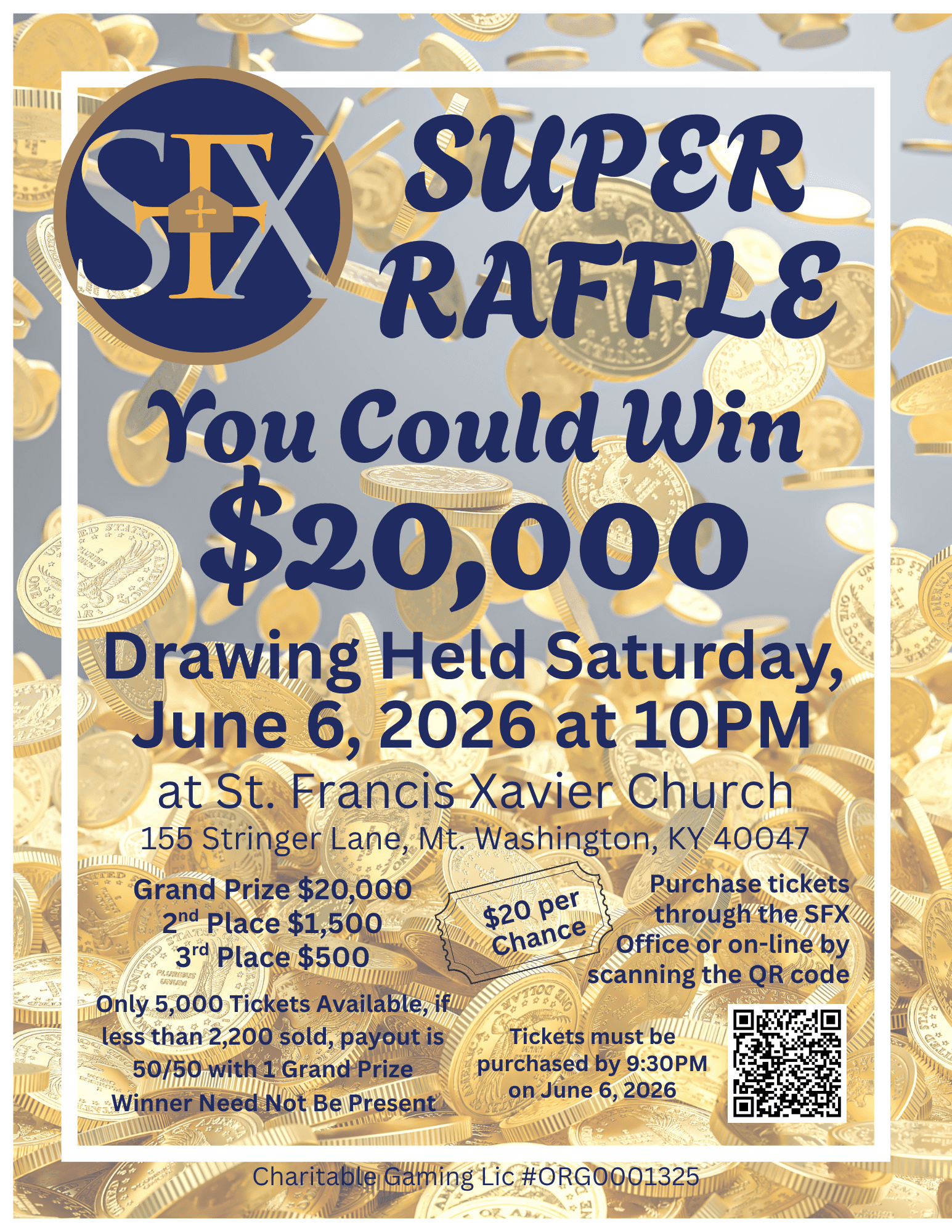 The 2026 Super Raffle is back, along with your chance to win $20,000. The drawing will take place Saturday, June 6th at SFX SummerFest. Pick up your pack of 5 Tickets in the Gathering Space before or after weekend Masses starting April 25th. You can also purchase tickets through Parish Soft – Giving by following the link below or scanning the QR code on the flyers around campus. Tickets must be received by 9:30PM on June 6, 2026 to be eligible.
