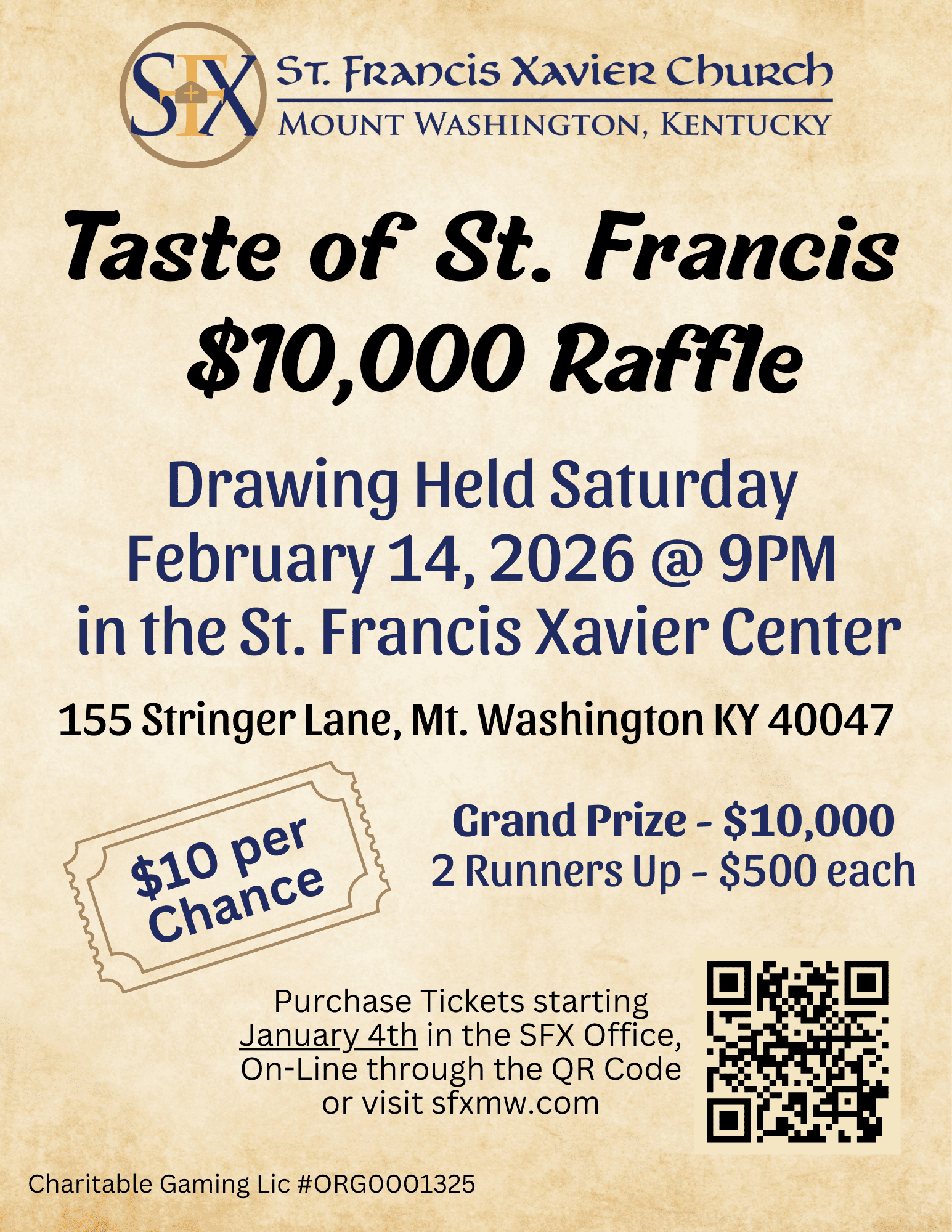 Your chance to win $10,000 is Now! Taste of St. Francis $10K Raffle Tickets are available for purchase on-line through the link below. You can purchase in person in the Gathering Space after weekend masses or in the Parish Office during business hours (Mon-Thur 9AM-4PM, Fri 9AM-12PM). Raffle tickets are $10 each.